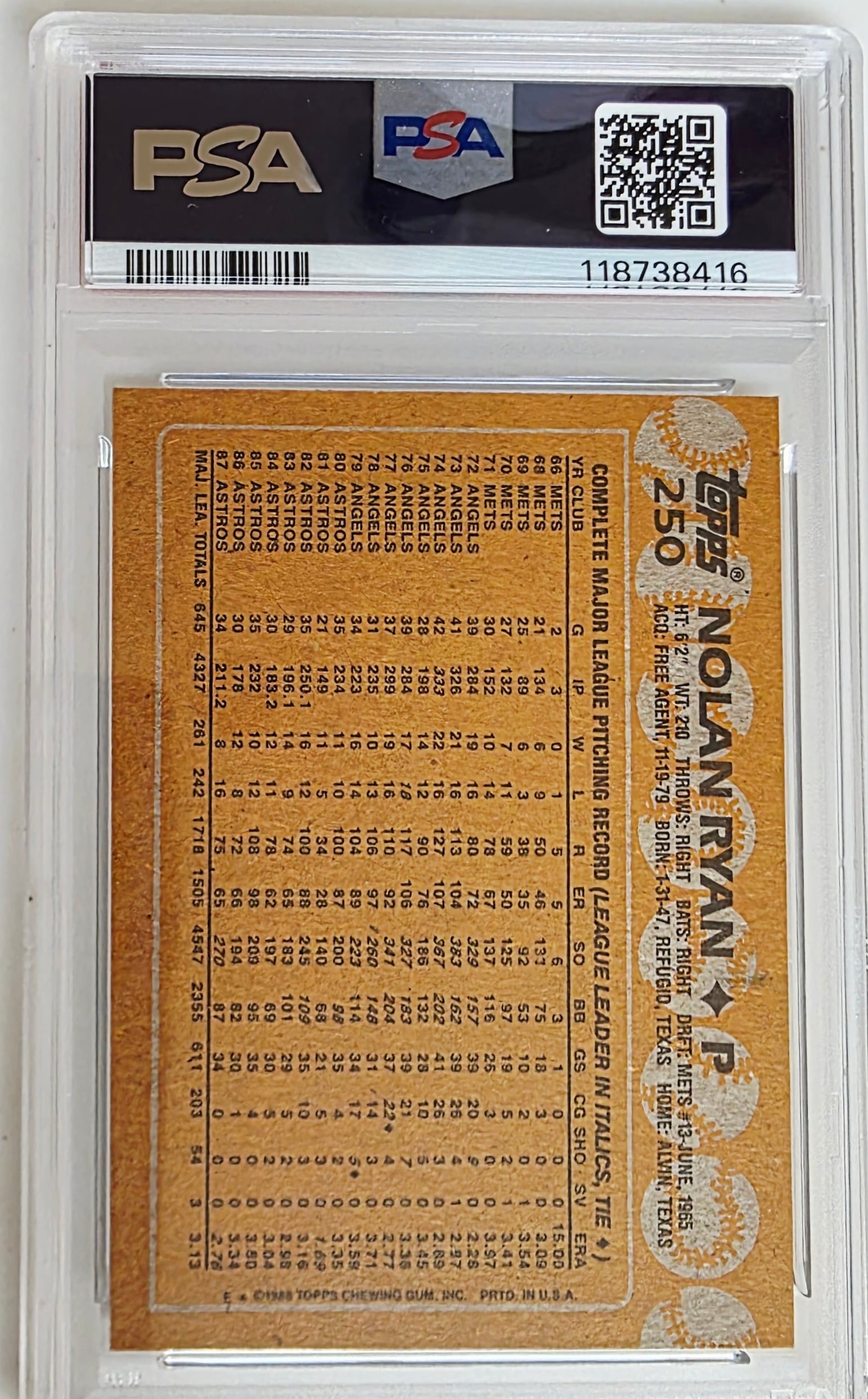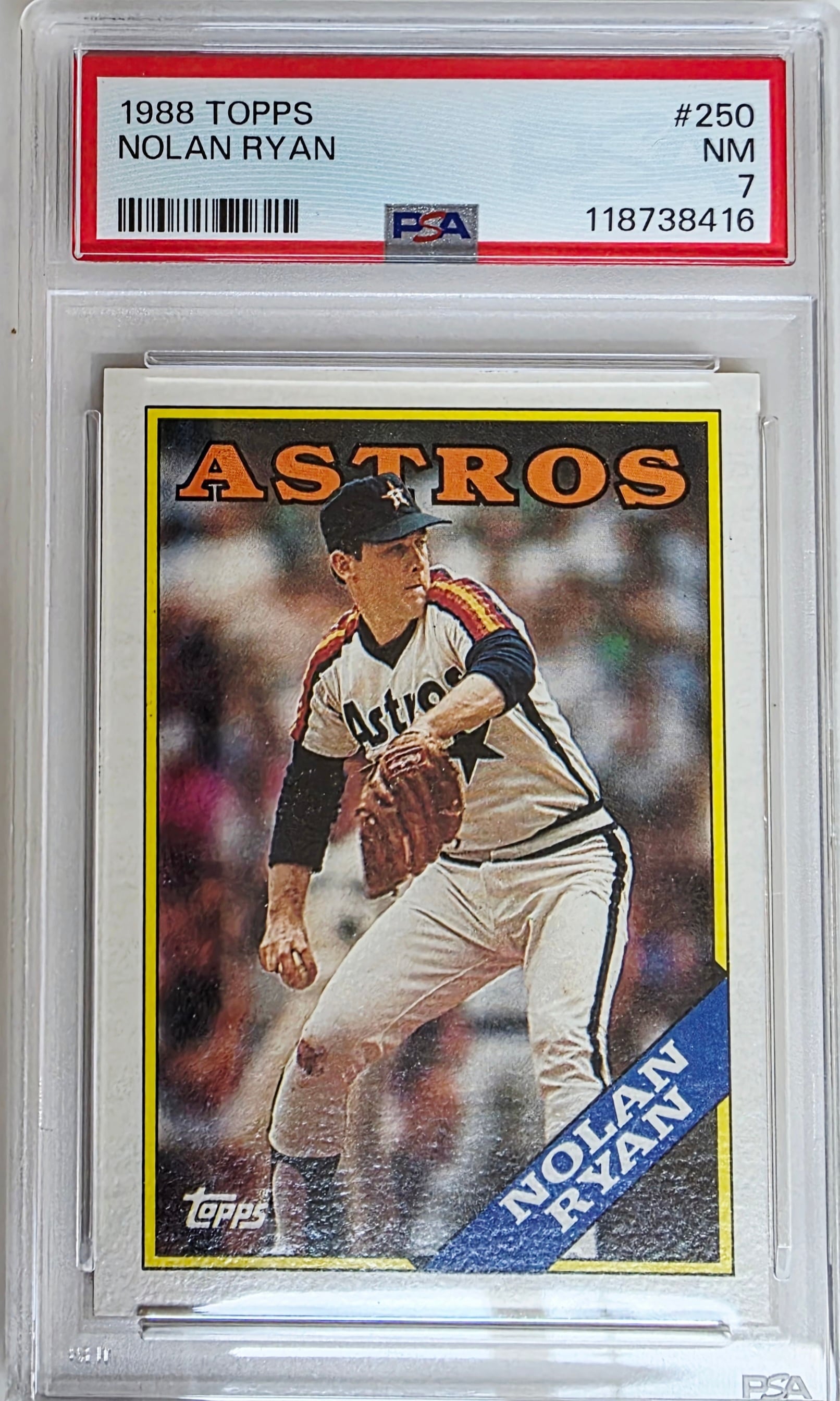 PSA grade NM7 1988 Nolan Ryan ノーラン・ライアンは、MLB史上最多の通算5,714奪三振を記録した伝説的な投手で、27年間にわたり圧倒的な速球で打者を支配しました。彼は7度のノーヒットノーランを達成し、驚異的な持久力と競争心で野球界に不滅の足跡を残しました。