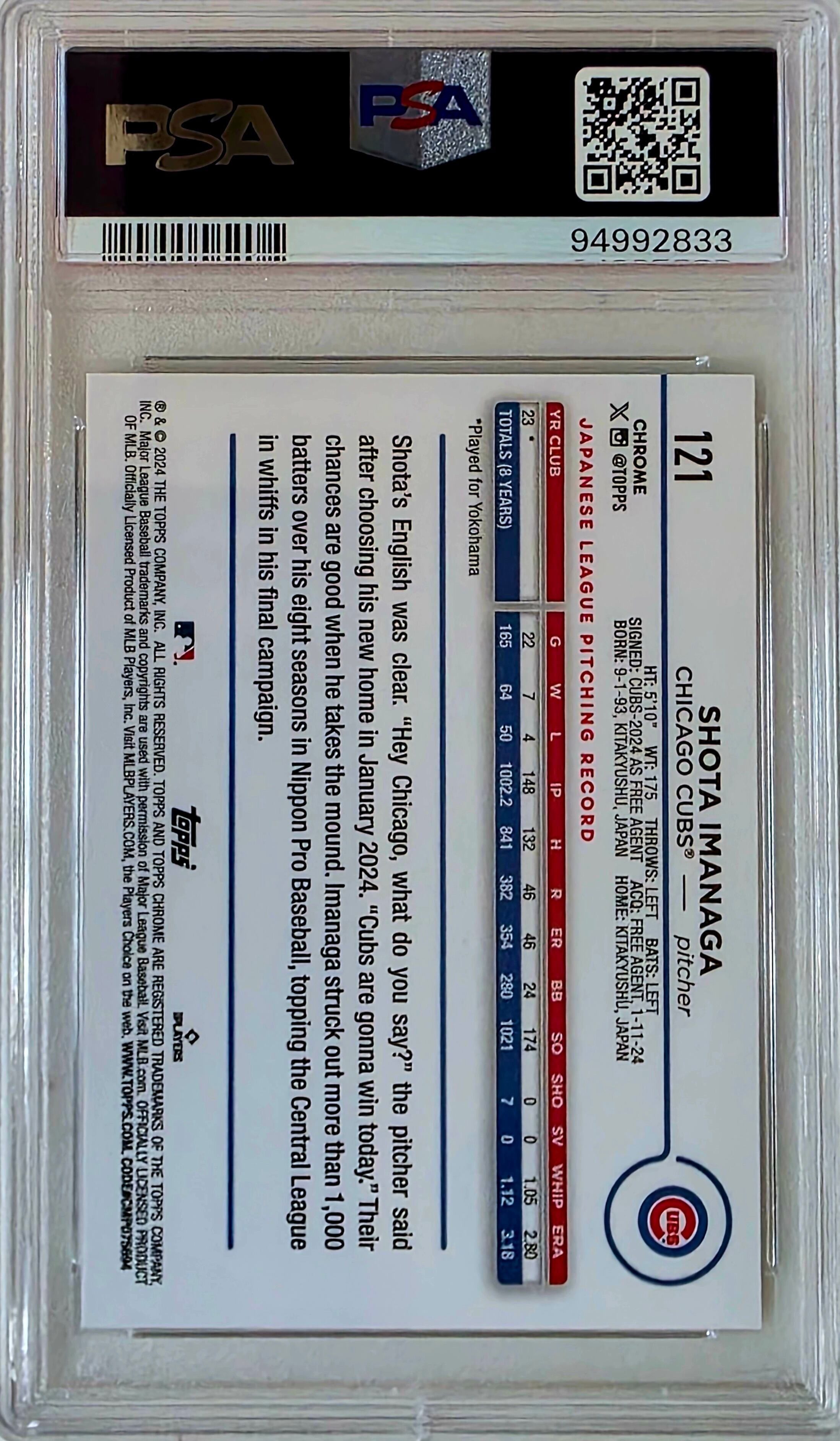 Topps Chrome 2024 PSA 9 Rookie Card 今永昇太は2024年にシカゴ・カブスでメジャーリーグデビューを果たし、15勝3敗、防御率2.91という圧巻の成績でナ・リーグのオールスターに選出されました。2025年シーズンも安定した投球を続け、通算23勝9敗、防御率2.95、奪三振264を記録しています。彼は「哲学する投手」として知られ、2024年9月にはカブスとして52年ぶりとなる本拠地でのノーヒットノーランを達成しました。
