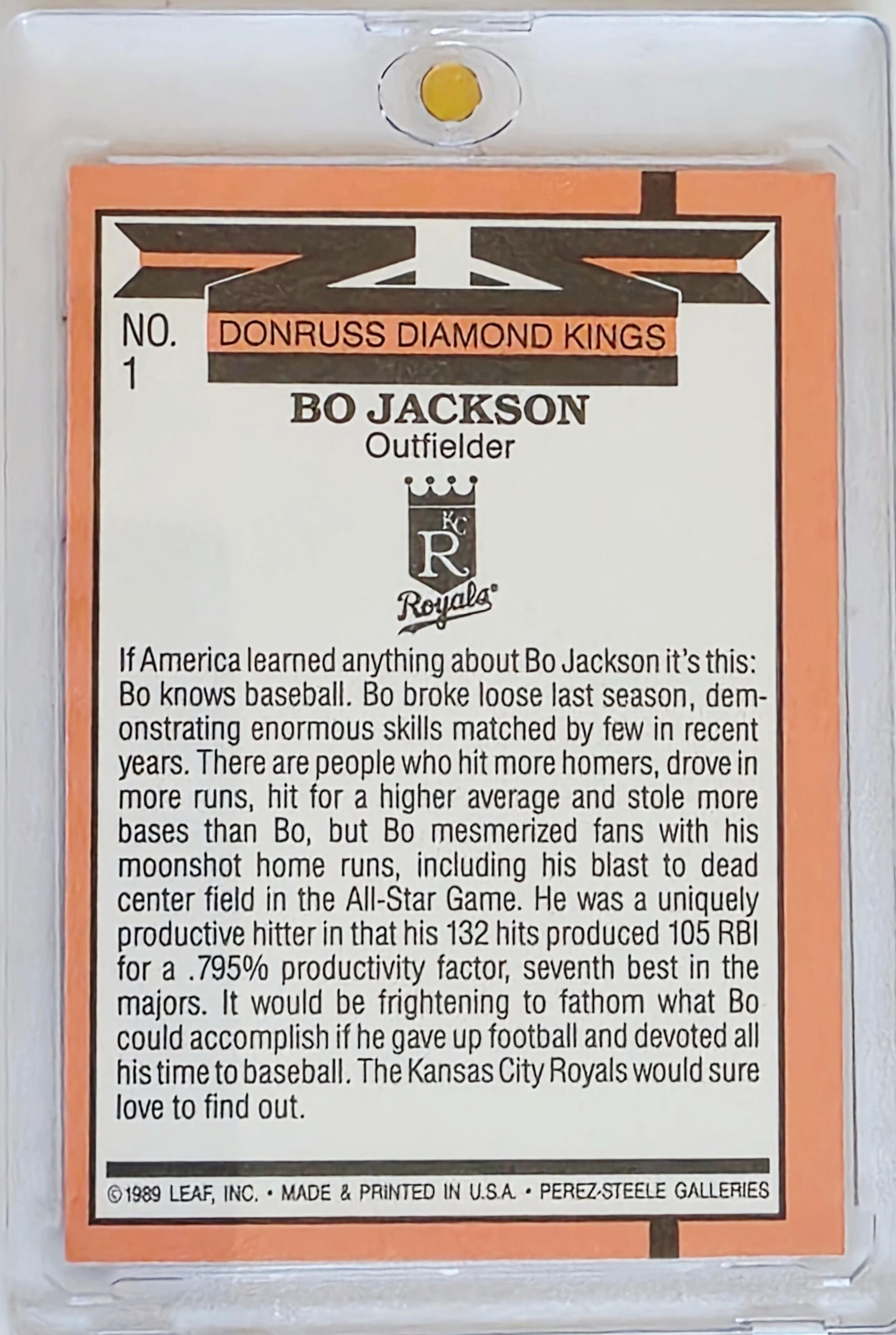 1989 Donruss Diamond Kings + 1990 61 + BC-1 Kansas City Royals. Bo Jackson was a legendary two-sport athlete who played professional baseball for the Kansas City Royals and football for the Los Angeles Raiders, becoming the only person ever named an All-Star in both MLB and the NFL. He won the Heisman Trophy in 1985 while playing college football at Auburn University, where he also excelled in baseball and track. His electrifying performances and rare athleticism made him a cultural icon, especially through Nike’s “Bo Knows” campaign in the late 1980s. A devastating hip injury in 1991 ended his football career prematurely, but he continued to play baseball until 1994 and remains one of the most celebrated athletes in American sports history.ボ・ジャクソンは、MLBのカンザスシティ・ロイヤルズとNFLのロサンゼルス・レイダースで活躍した伝説的な二刀流アスリートで、両リーグでオールスターに選ばれた唯一の人物です。1985年にアラバマ州オーバーン大学でハイズマン賞を受賞し、野球と陸上競技でも卓越した才能を発揮しました。その驚異的な身体能力とパフォーマンスは「Bo Knows」キャンペーンを通じて文化的アイコンとなりました。1991年の股関節の大怪我によりフットボール選手としてのキャリアは終わりましたが、1994年まで野球を続け、今なおアメリカスポーツ史上最も称賛されるアスリートの一人です。