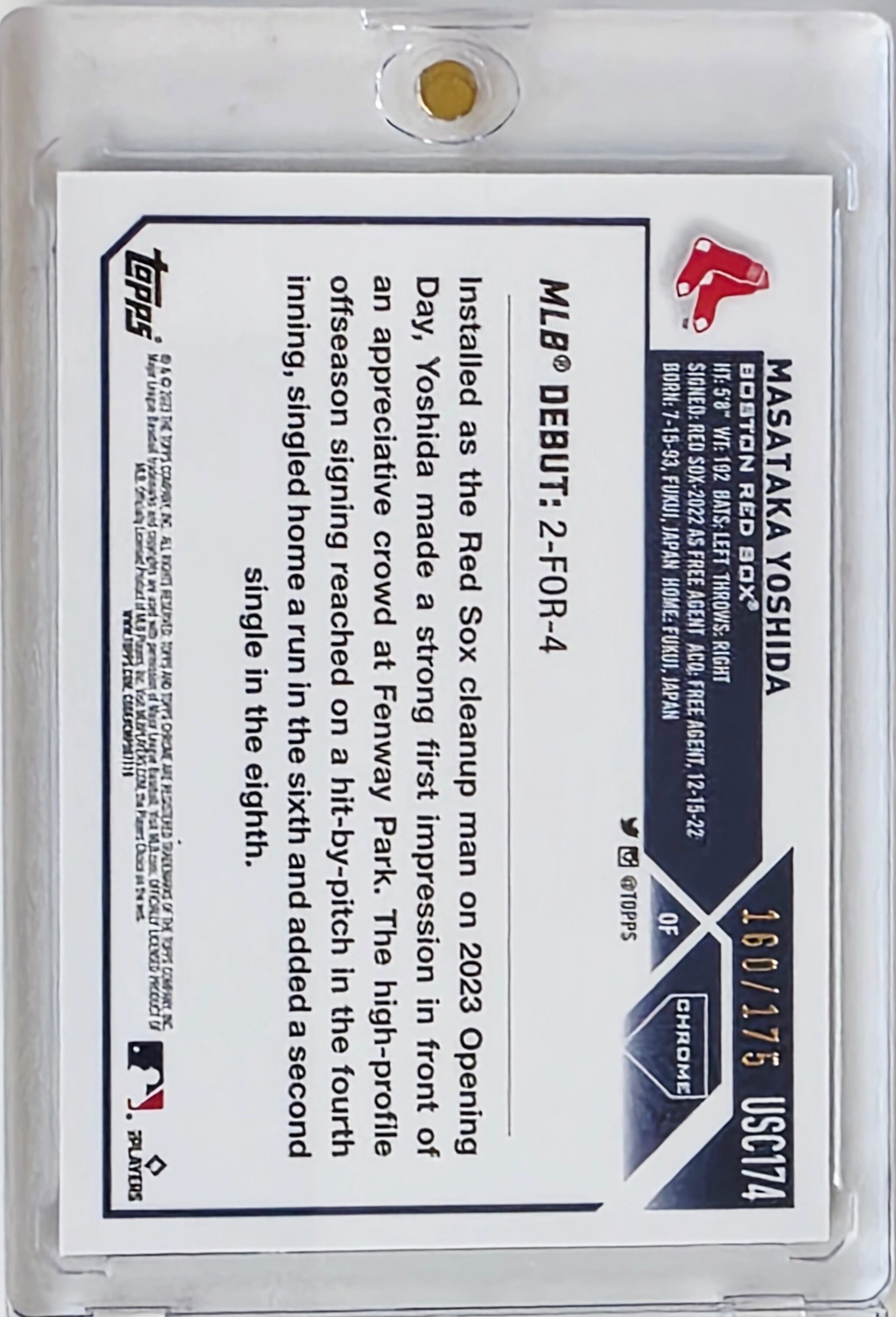 吉田正尚ルーキーカード Masataka Yoshida Topps Chrome Rookie Debut 160/175 吉田正尚は日本のプロ野球・オリックス・バファローズでキャリアをスタートし、複数回のオールスター選出、2度の首位打者獲得、そして2022年の日本シリーズ優勝に貢献しました。2023年にはMLBのボストン・レッドソックスに移籍し、アメリカンリーグ新人王投票で6位に入り、日本出身の野手として初めて同球団でフルシーズンを完走しました。選球眼の良さと勝負強さで知られ、2025年シーズン終了時点でMLB通算打率.280、本塁打27本、打点141を記録しています。