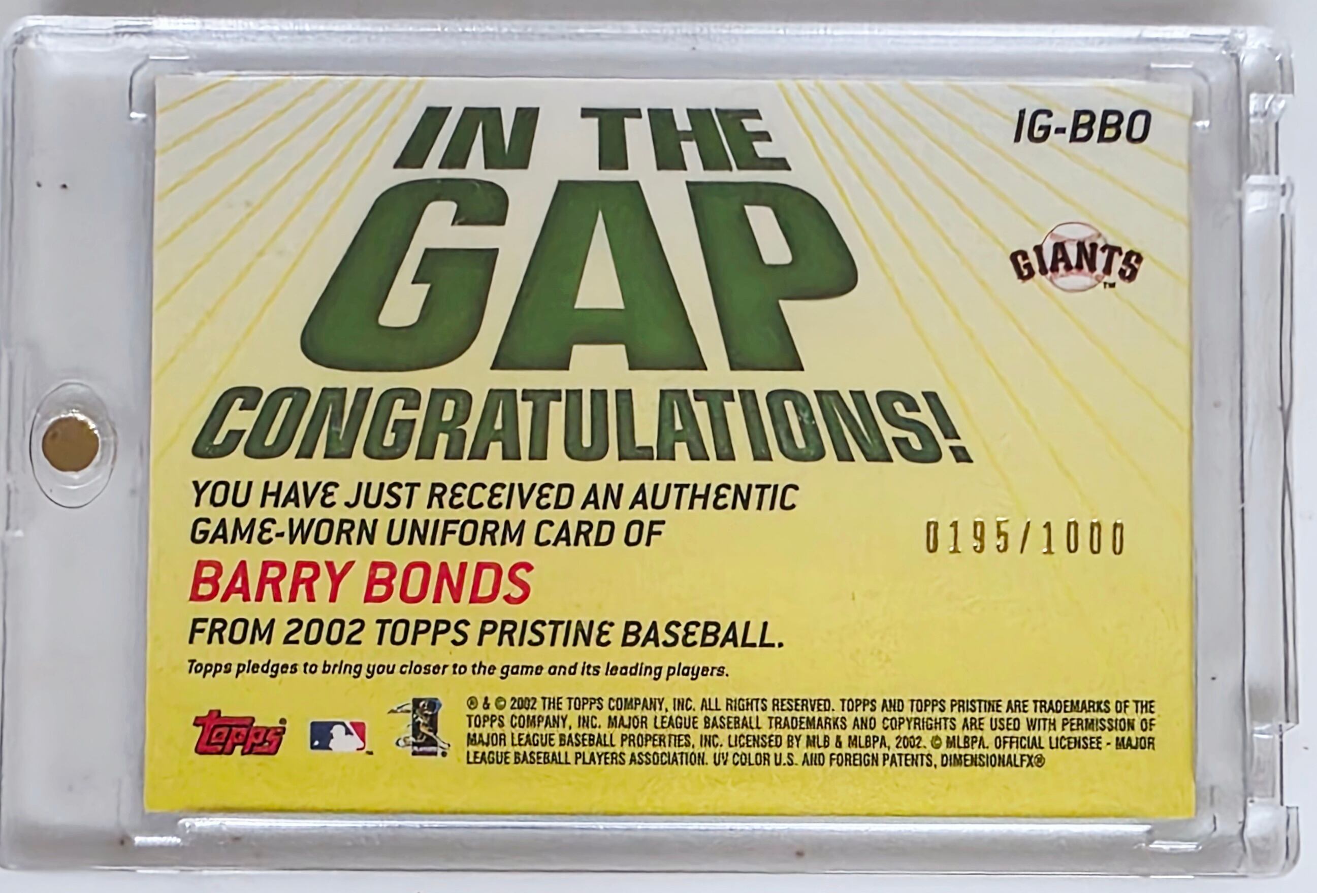 Barry bonds 2002 In the Gap Uniform Card #0195/1000
