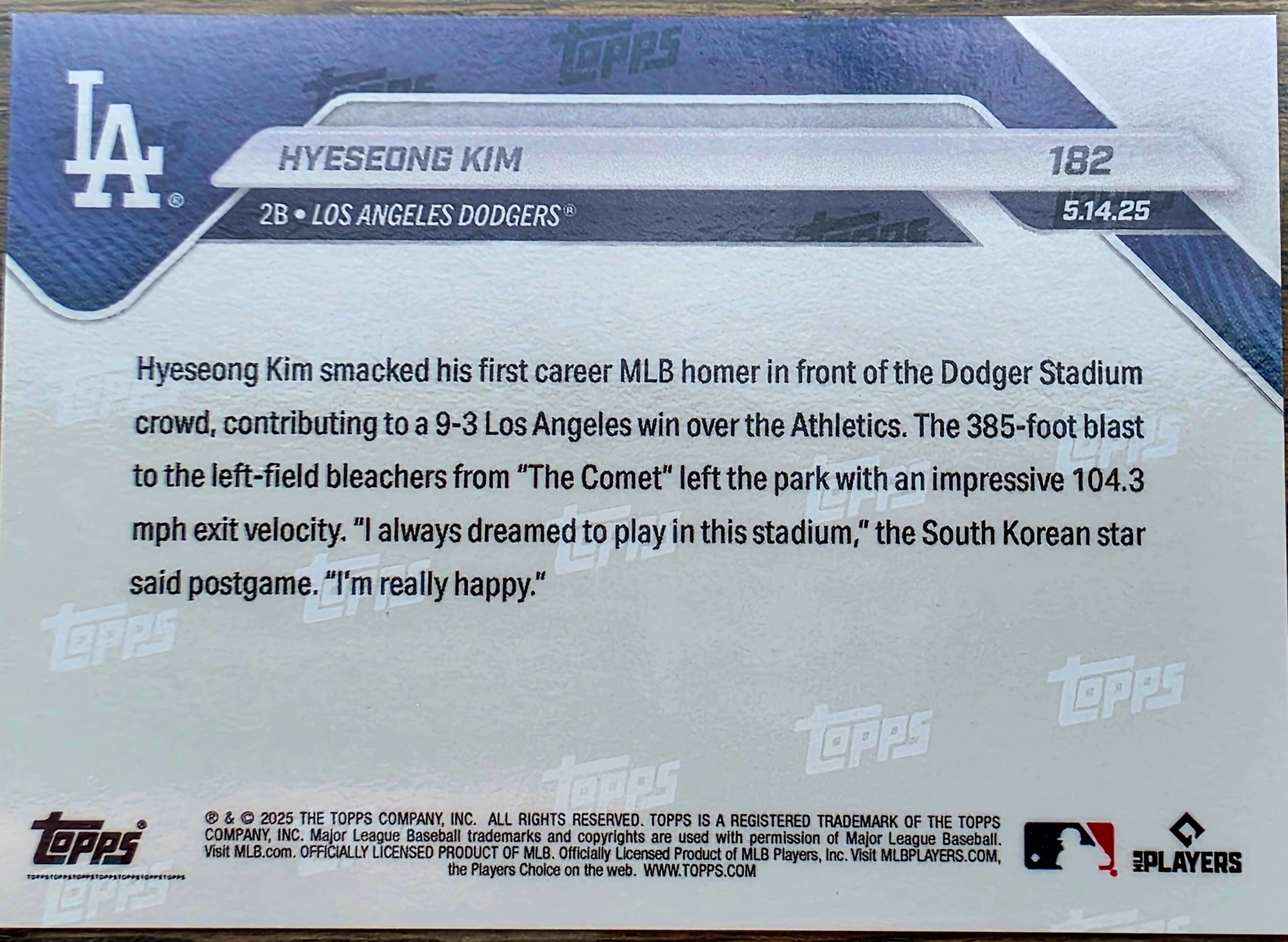 The "Commet" burst on to the seen this year with the Dodgers. Hyeseong Kim, nicknamed “The Comet” for his blazing speed, began his professional career with the Nexen/Kiwoom Heroes in the KBO League, where he earned four Golden Gloves and led the league in stolen bases in 2021. Over eight seasons in Korea, he posted a .304 batting average with 1,043 hits, 386 RBIs, and 211 stolen bases, culminating in a standout 2024 season before being posted to MLB. He made his Major League debut with the Los Angeles Dodgers on May 3, 2025, quickly showcasing his versatility across second base, shortstop, and center field while continuing to contribute with speed and contact hitting.