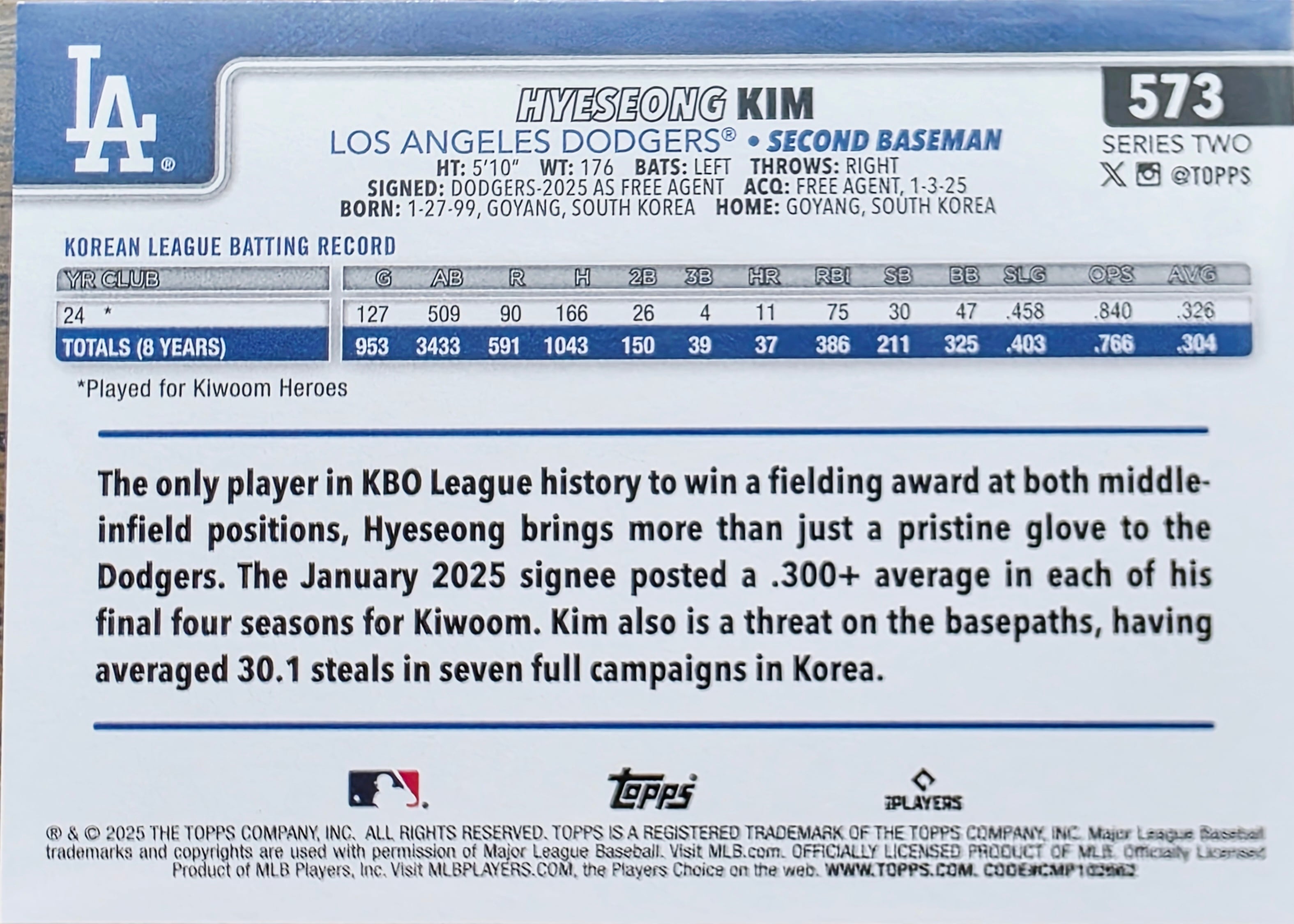 「彗星」の異名を持つキム・ヘソンは、今年ドジャースで一躍脚光を浴びました。驚異的なスピードから「彗星」の異名を持つキム・ヘソンは、KBOリーグのネクセン/キウムヒーローズでプロキャリアをスタートさせ、2021年にはゴールデングラブ賞を4回受賞し、盗塁王にも輝きました。韓国での8シーズンで打率.304、1,043安打、386打点、211盗塁を記録し、2024年にはMLBに昇格するなど、目覚ましい活躍を見せました。2025年5月3日、ロサンゼルス・ドジャースでメジャーデビューを果たし、二塁、遊撃、中堅と多方面で活躍する多才ぶりを瞬く間に披露し、俊足とコンタクトヒットでも活躍を続けました。