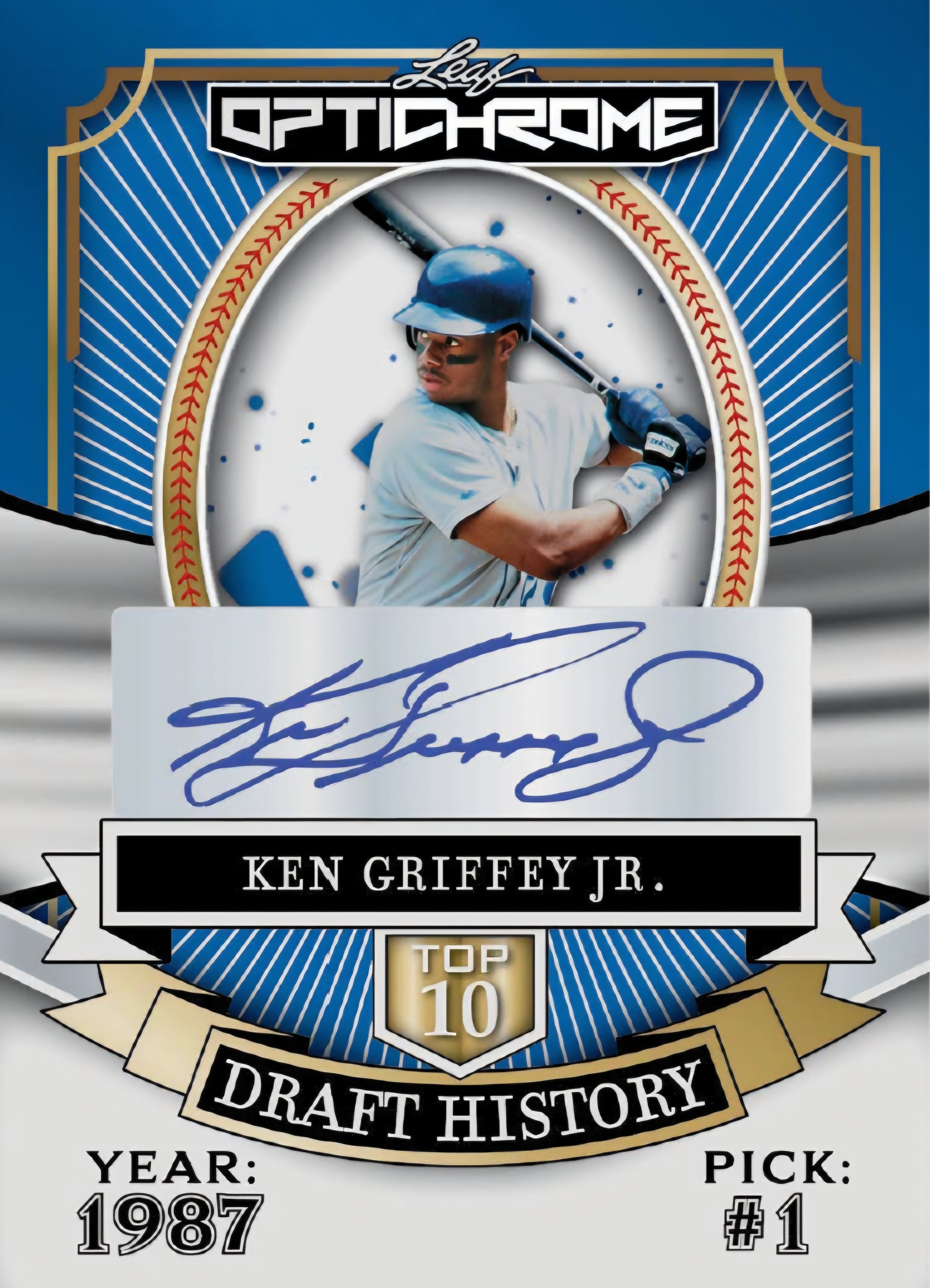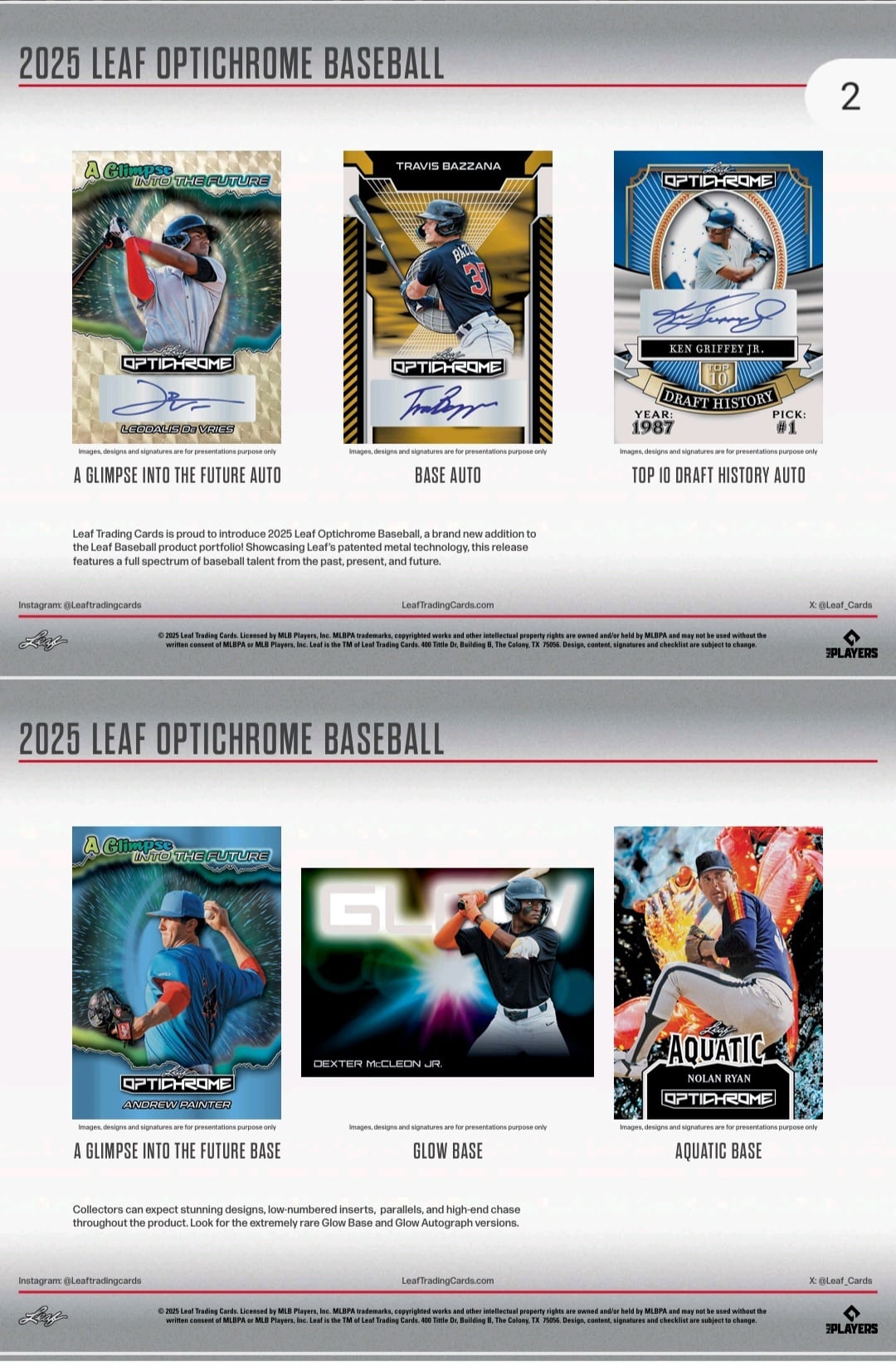 A brand‑new addition to the Leaf Baseball portfolio, Optichrome delivers premium metal stock, vibrant parallels, and a full spectrum of baseball’s biggest names—from legends to rising stars.