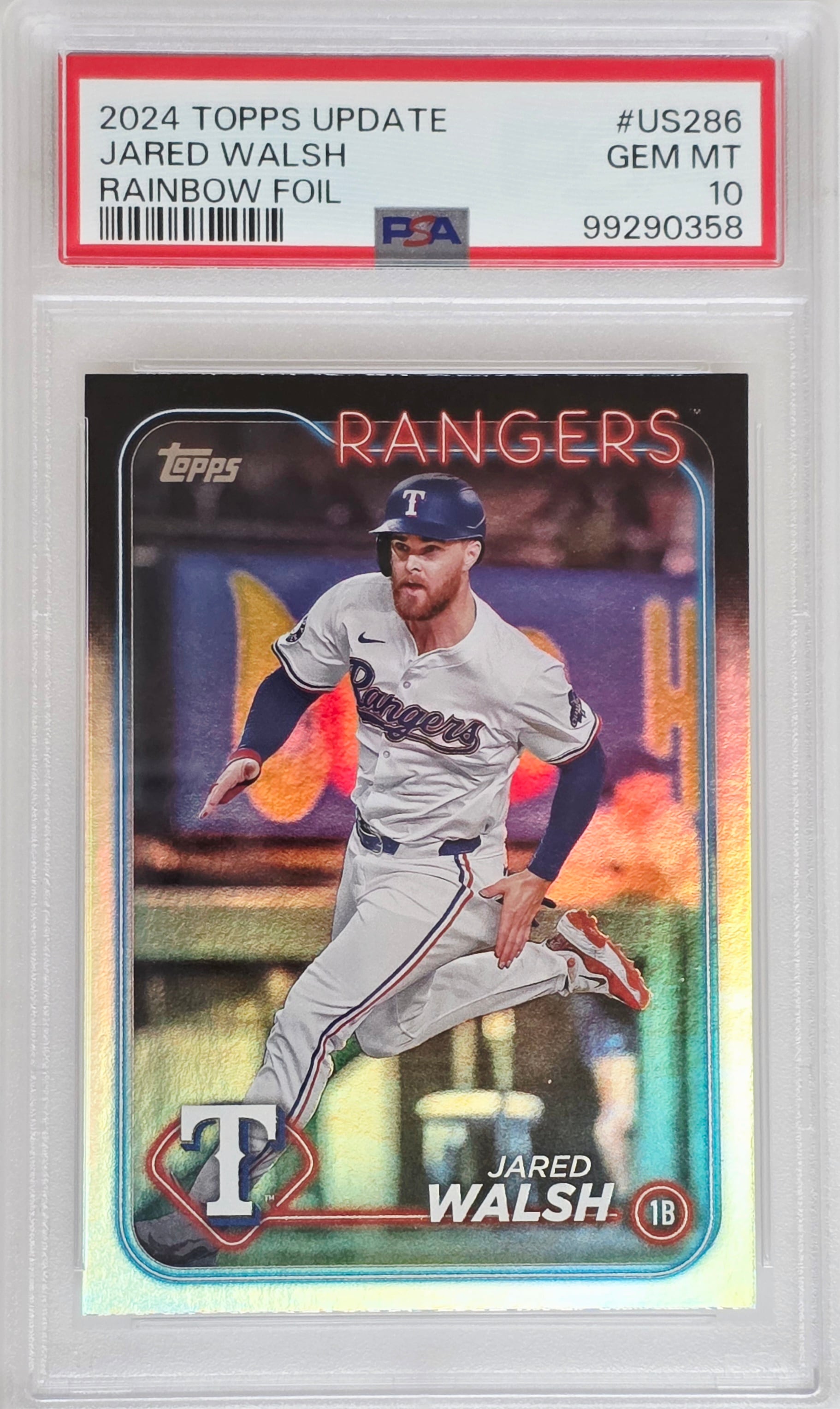 2024 Topps Update の ジャレッド・ウォルシュ/Rainbow Foil/PSA10 は、テキサス・レンジャーズ移籍後の姿を切り取った、フォイル仕様かつ完璧グレードの希少な1枚です。